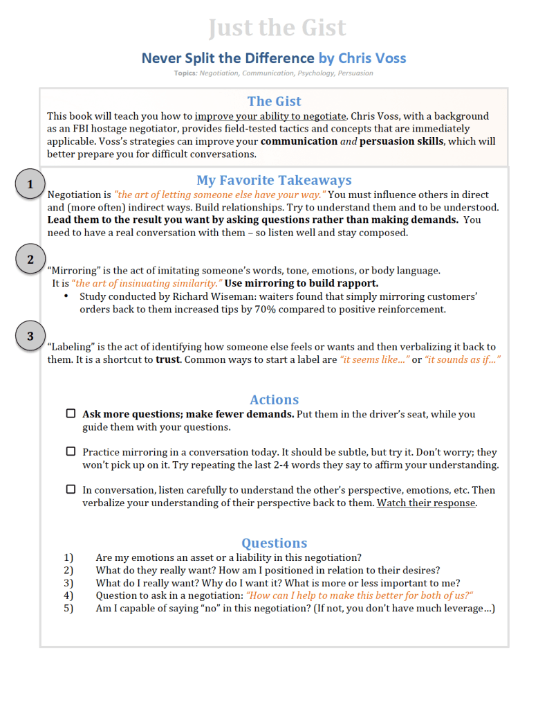 - Trigger “that’s right” with a summary of their perspective in your words, using silent pauses, mirroring, labeling, etc. to entice a “that’s right” response.