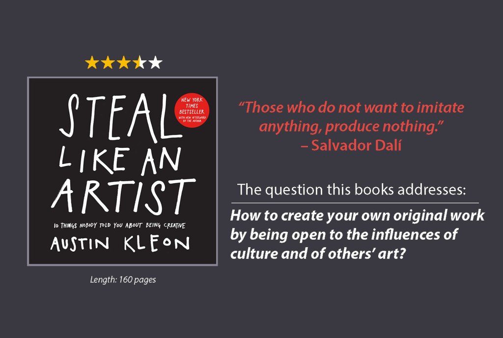 Summary: Every artist steals their ideas from others, both consciously and unconsciously. Or rather, we are heavily influenced by others’ work. So immerse yourself in great art – books, music, film, etc. Look for inspiration in the work of others. Pay attention to what energizes you and seek more of it. “All creative work builds on what came before.”