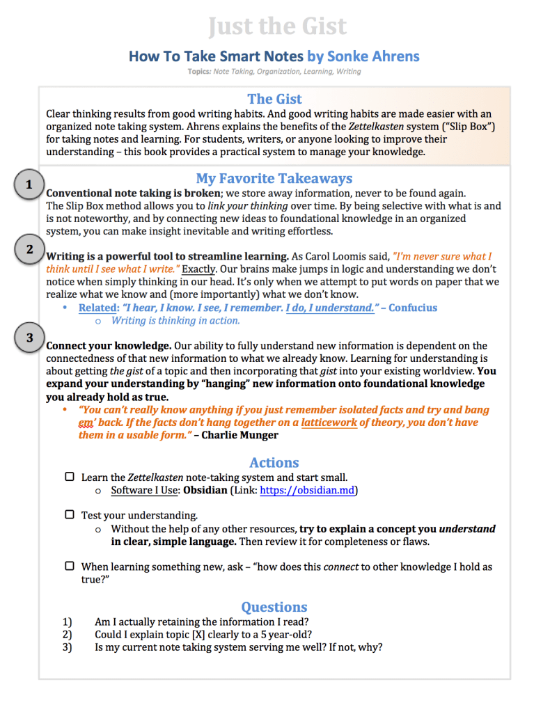 Summary: Make a habit of taking smart notes. Change is hard. Build it into an existing habit if needed. If you aren’t serious about building the habit, then you will likely just do what you have always done in the past.