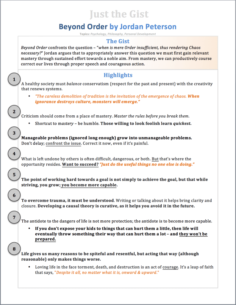 Beyond Order confronts the question – “when is mere Order insufficient, thus rendering Chaos necessary?” Jordan argues that to appropriately answer this question we must first gain relevant mastery through sustained effort towards a noble aim. From mastery, we can productively course correct our lives through proper speech and courageous action.