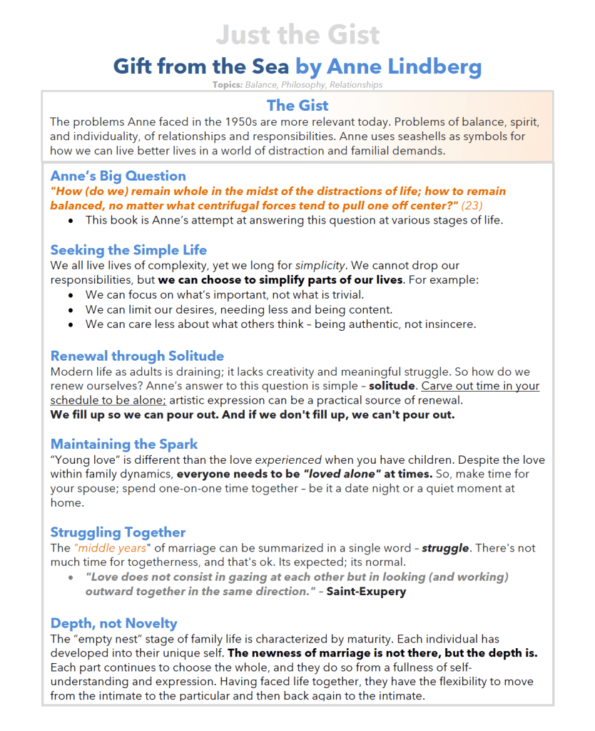 The problems Anne faced in the 1950s are more relevant today. Problems of balance, spirit, and individuality, of relationships and responsibilities. Anne uses seashells as symbols for how we can live better lives in a world of distraction and familial demands.
